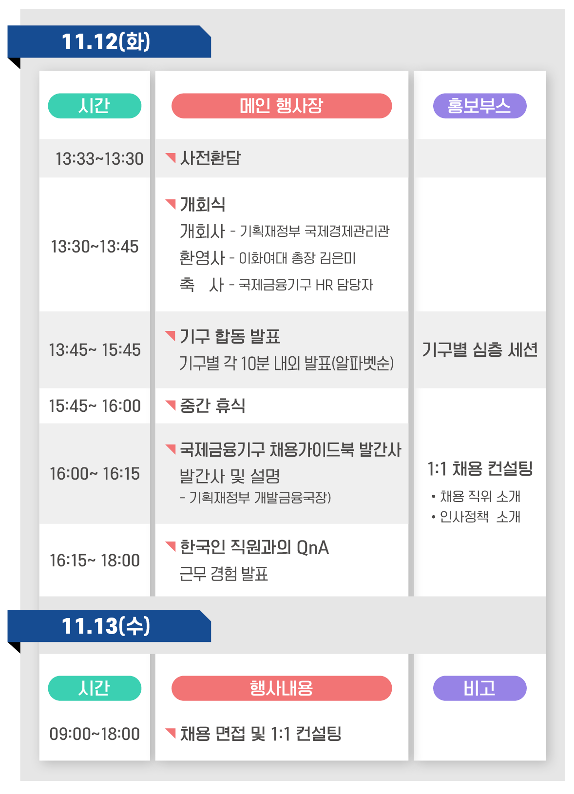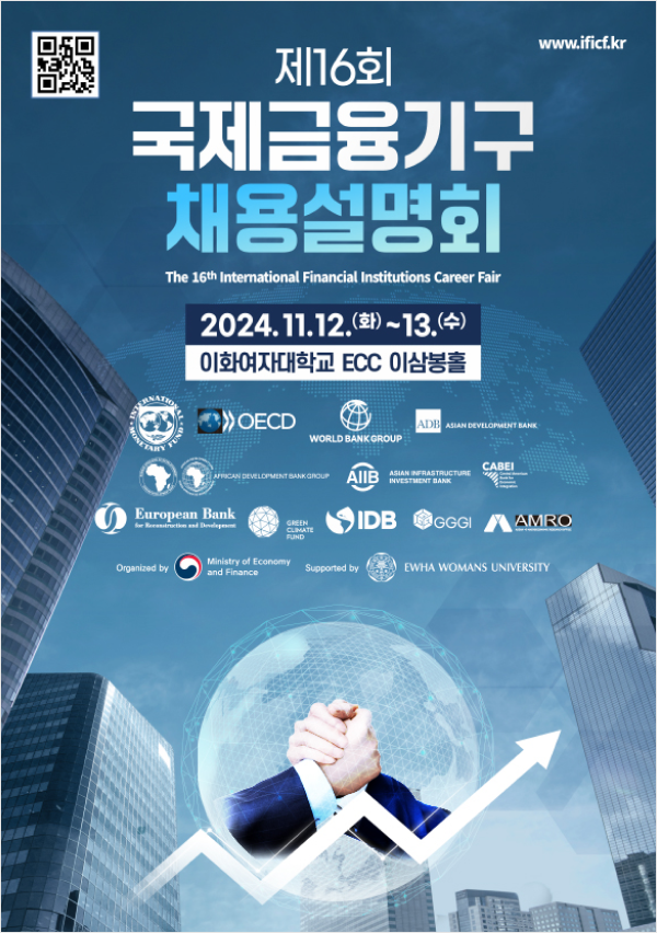 - 기획재정부는 ’22.11.12(화)~13(수) 이화여자대학교 ECC이삼봉홀에서 「제16회 국제금융기구 채용설명회」를 개최할 예정입니다.